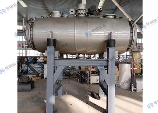 振動(dòng)干燥機(jī)由干燥機(jī)本體、過(guò)濾器、真空系統(tǒng),三部分組成。本體設(shè)有夾套,用于通導(dǎo)熱油給內(nèi)腔加熱,兩側(cè)分別設(shè)有橡膠彈 簧支撐,激振單元設(shè)置在筒體側(cè)面,動(dòng)力由振動(dòng)電機(jī)驅(qū)動(dòng)。