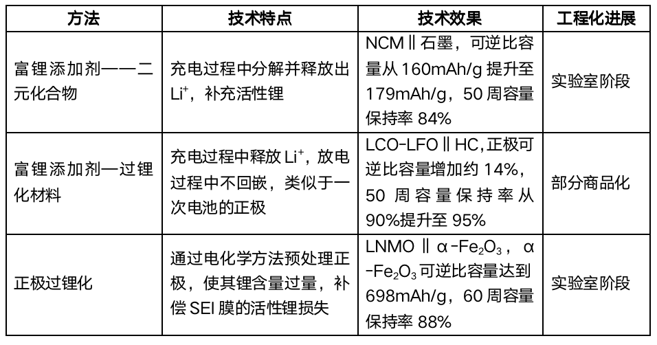 正極預(yù)鋰化是指通過(guò)額外添加的活性鋰源,來(lái)補(bǔ)償不可逆的活性鋰損失,確保電池內(nèi)活性鋰的充足。相較于流程復(fù)雜?安全風(fēng)險(xiǎn)高,且對(duì)環(huán)境和工藝要求較高的負(fù)極預(yù)鋰化技術(shù),目前研究較多的正極預(yù)鋰化技術(shù)集中在高性價(jià)比的富鋰添加劑開發(fā)方面。