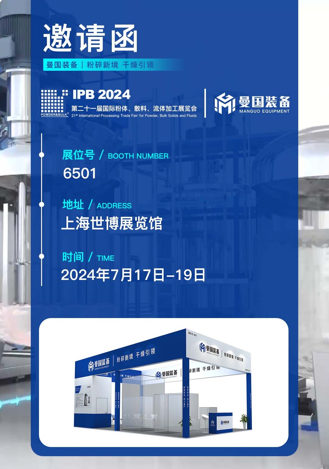 此次上海國(guó)際粉體、散料、流體加工展我們將攜主營(yíng)產(chǎn)品機(jī)械磨一體機(jī)、氣流粉碎機(jī)、振動(dòng)干燥機(jī)、螺帶混合機(jī)、反應(yīng)釜、振動(dòng)輸送機(jī)參展。 讓我們相約上海這個(gè)國(guó)際化大都市,把您的需求告訴我,用我的專業(yè)打動(dòng)您。7月17日...